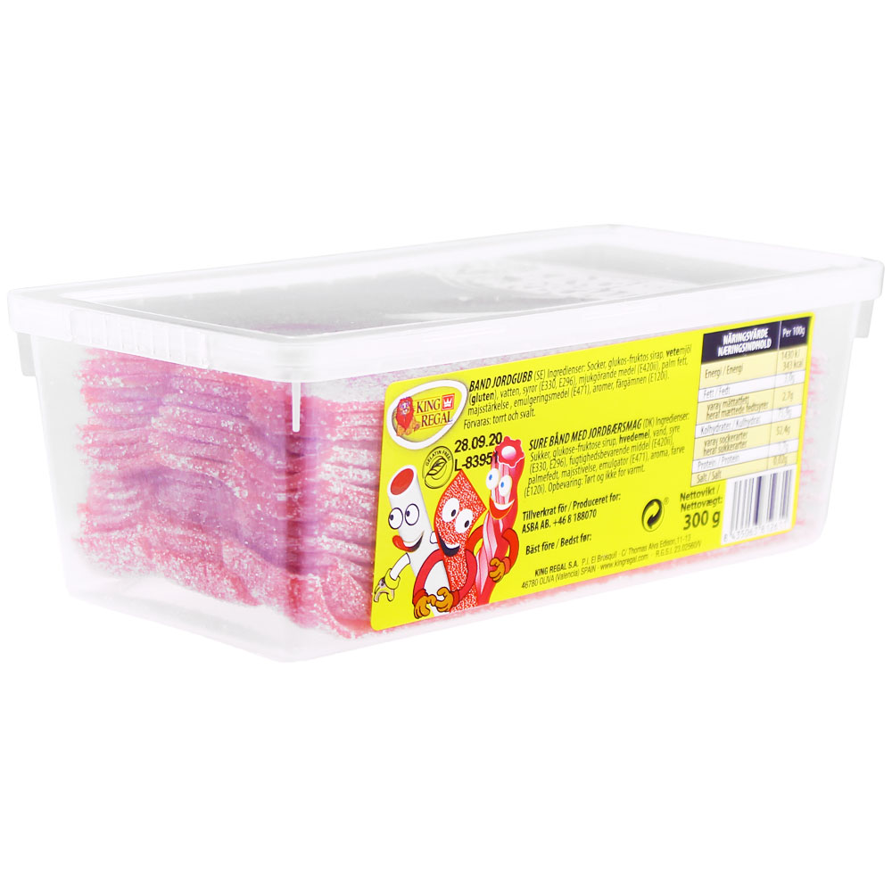 Detta läckra jordgubbsgodis i from av ett godisband är ett utmärkt val av godis till både barnkalaset och myskvällen hemma i soffan. Jordgubbsremmar är sedan länge en stor favorit och en riktig klassiker i mångas godispåsar.