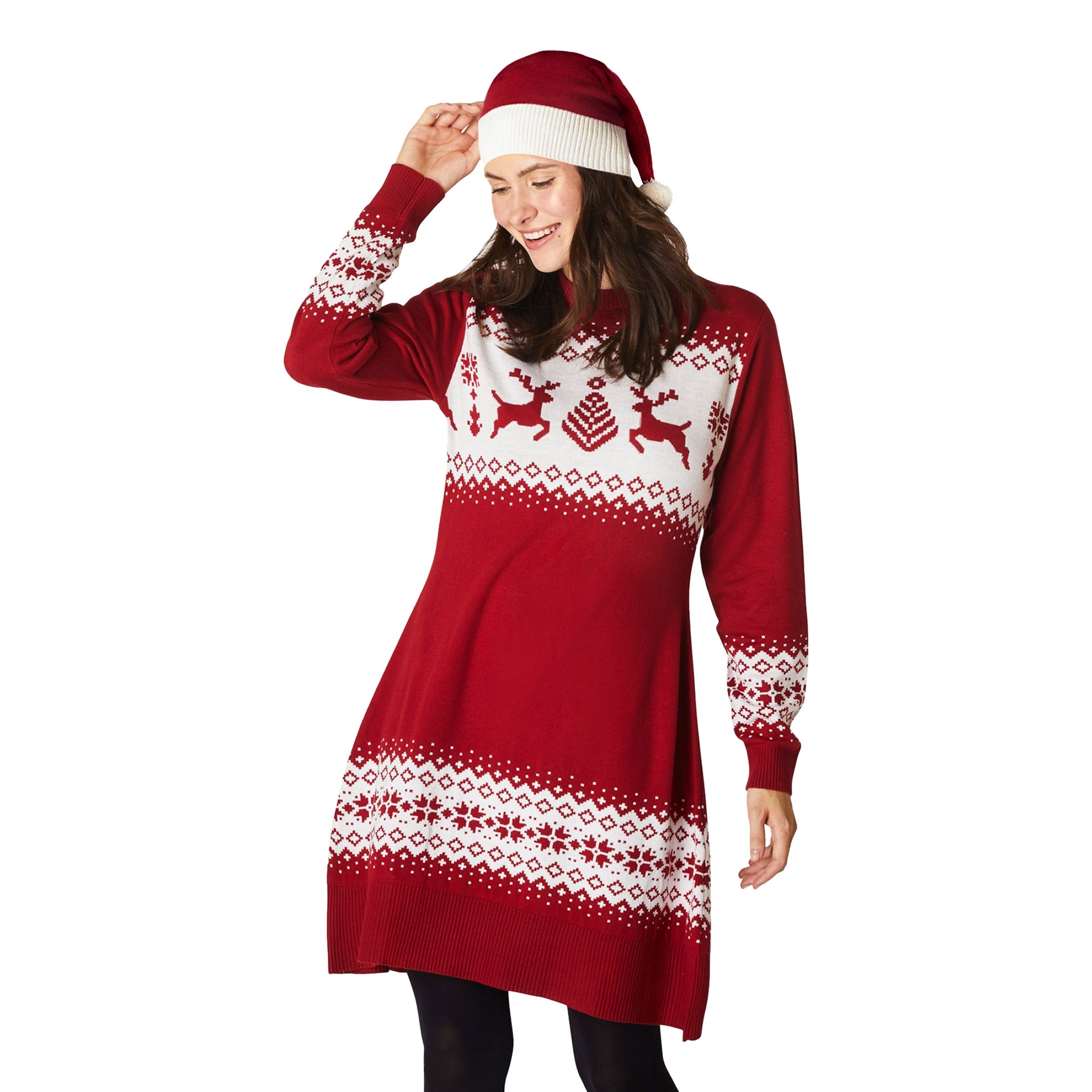 Ren Julklänning är en stickad och fin julklänning som har den perfekta längden. Klänningen är röd med julmotiv i vitt. Matchande tomteluva medföljer och gör outfiten komplett. Tvättas i maskin på skonsamt program, max 30°C. Torkas platt.