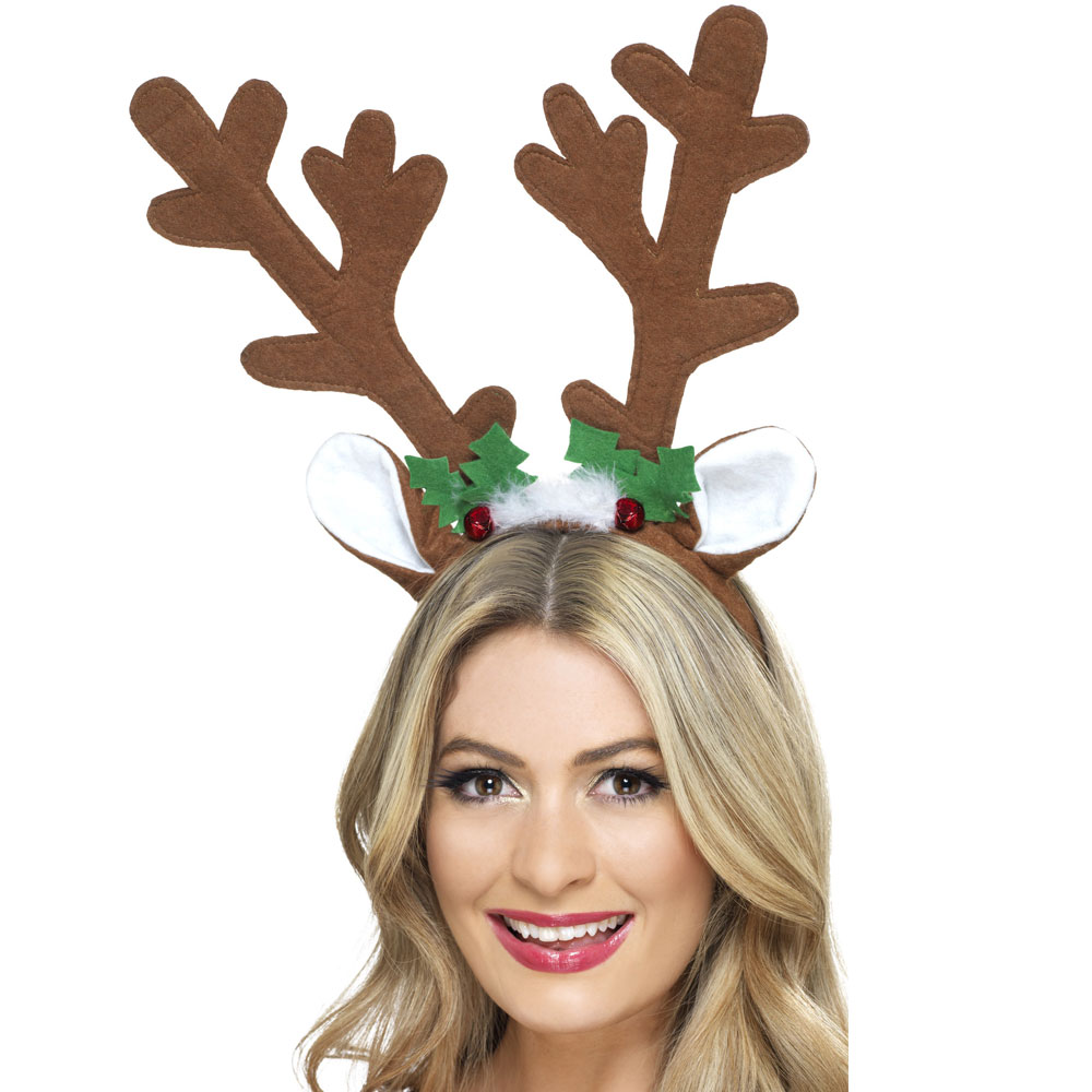 Renhorn på Diadem med Bjällror innefattar ett diadem med bruna filtliknande horn och öron. På hornen sitter två röda bjällror med gröna blad.