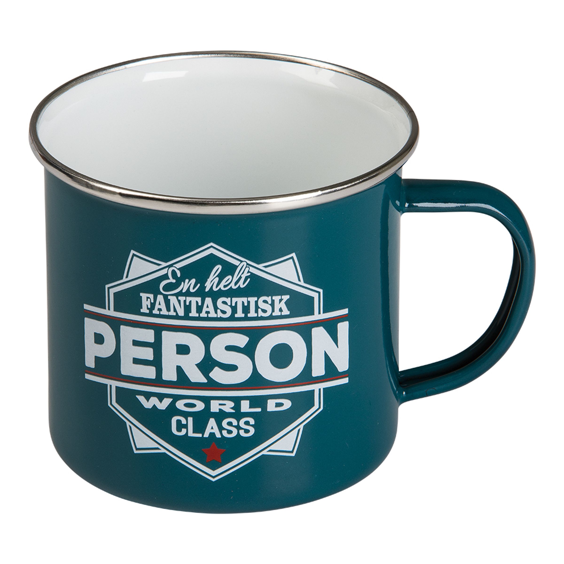 Retromugg med Text är en mugg i retro stil som har tryck på båda sidor. Trycket består av olika designer med fokus på texter såsom "The man, the myth, the fishing legend" och "morfar – simply the best". Det finns muggar för familjemedlemmar, djurvännen, läraren, fotbollsnörden, din meckar-vän och så många fler. Vem du än har i ditt liv så finns det en mugg för hen! Muggarna mäter ca 9 cm höga och är tillverkade i emaljerad plåt. Säljs styckvis.