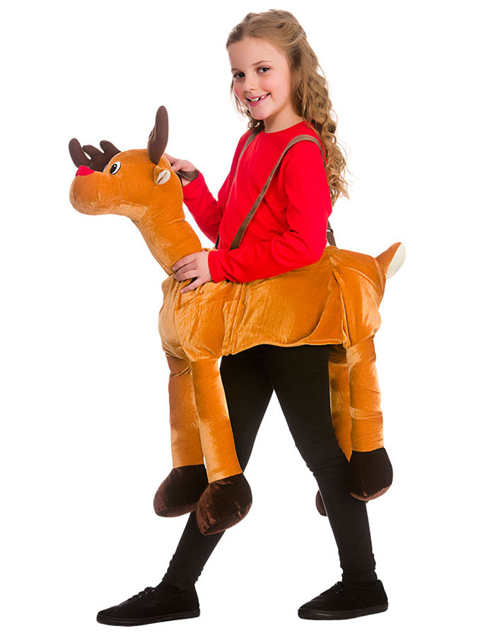 Ridande Ren Maskeraddräkt Barn innehåller en maskeraddräkt som föreställer renen Rudolf med uppstoppade ben, huvud och hals samt utstickande mule, horn öron och svans. Dräkten klivs enkelt i och bärs på axlarna som ett par hängslen. Dräkten har även en liten ögla att hålla i vid renens huvud. När barnet bär dräkten ser det ut som att barnet rider på renen.