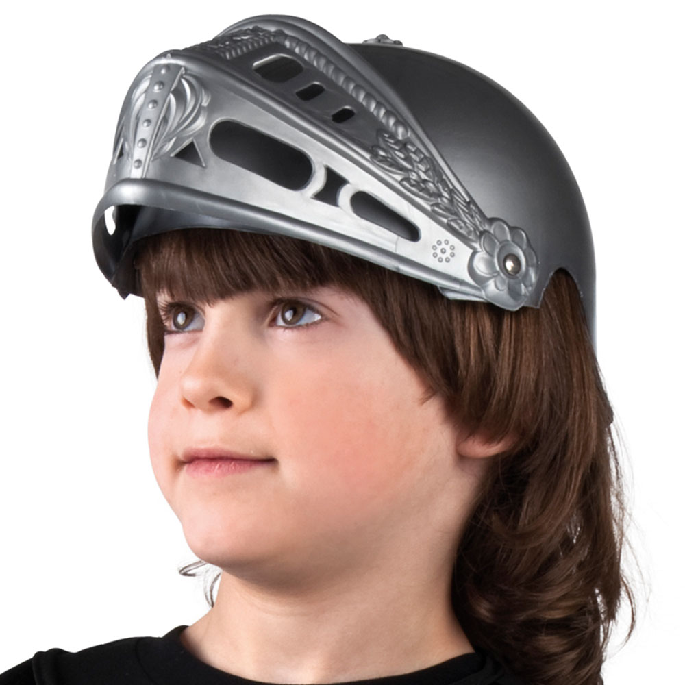 Riddarhjälm Barn består av en riddarhjälm i grå plast, med ett visir som går att fälla ner.