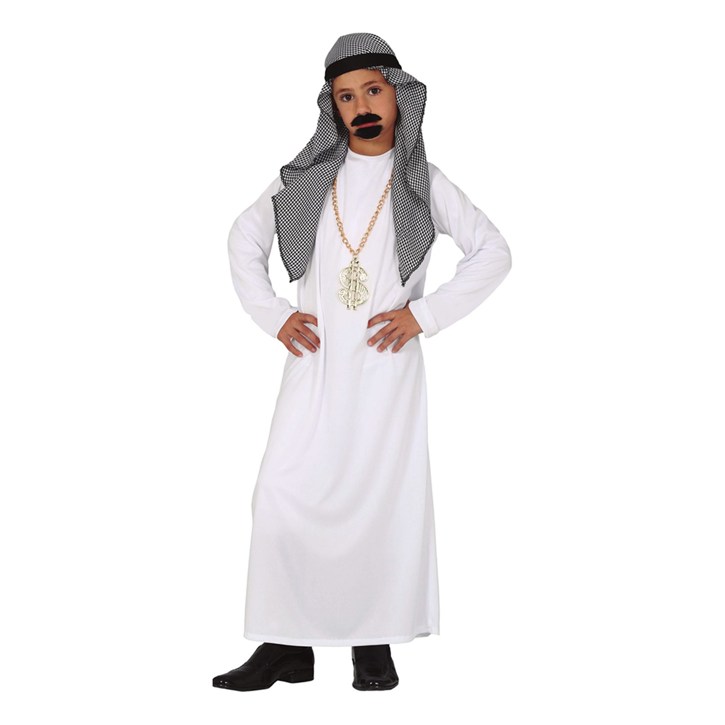 Rik Shejk Barn Maskeraddräkt inkluderar en vit lång dräkt och en svart och vit huvudbonad. Maskeraddräkten är tillverkad i 100 % polyester och finns i tre storlekar till barn. Smycket, mustasch och skor som syns på bilden ingår inte. Finns i storlek Small (5-6 år), Medium (7-9 år) och Large (10-12 år).
