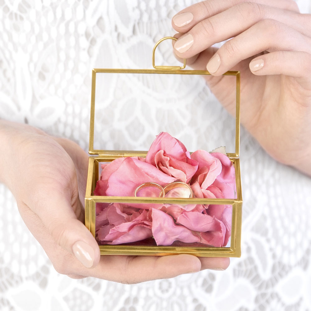 Är du ute efter en elegant ringask till ditt bröllop så kan denna fina ringask av glas vara några för dig. En riktigt fin glasask med guldiga kanter som får vigselringarna att se extra fina ut. Lägg ner ringarna som de är eller pynta asken lite extra med exempelvis blommor eller ett fint tyg för en extra stilfull look. Efter bröllopets slut kan den även bli en fin inredningsdetalj till ditt hem.