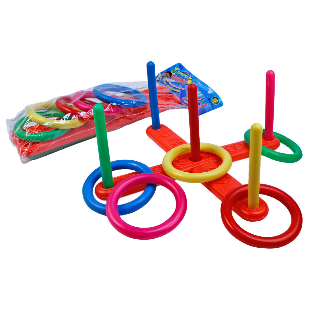 Ringspel består av ett utomhusspel för barn som går ut på att kasta ringar och samla poäng. Innehåller bas i två delar, fem pinnar samt fem ringar. Tillverkat i plast.
