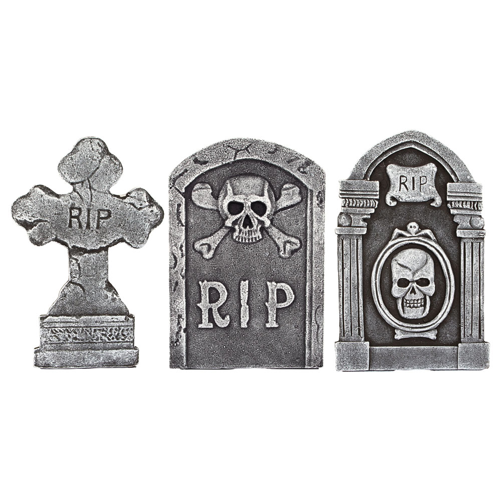 RIP Gravsten Halloweendekoration omfattar en grå gravsten av frigolit med texten "RIP" framtill. Gravsten är ca 31 cm stor och finns i tre olika varianter. Vilken variant du får slumpas.