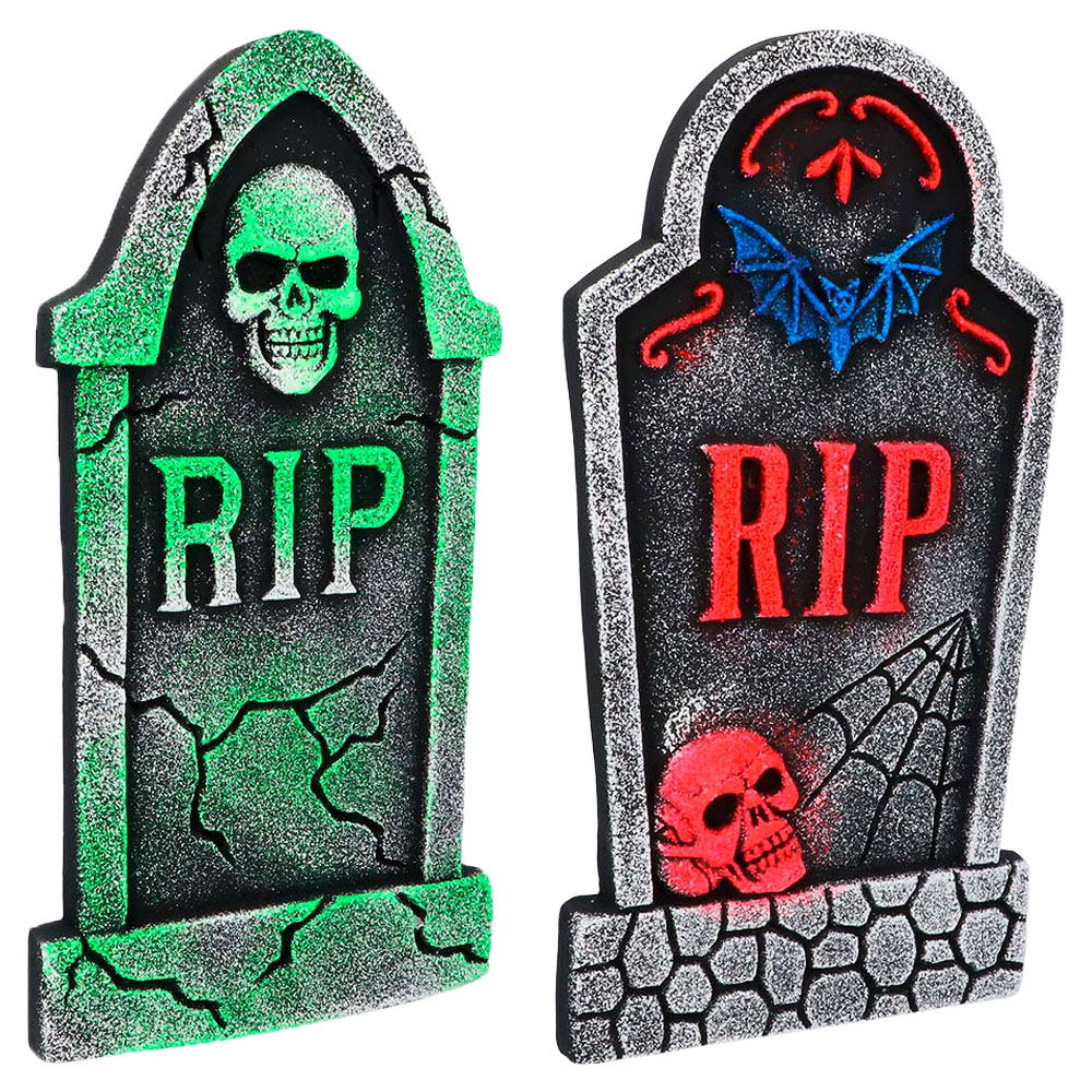 RIP Gravsten Neon omfattar en gravsten i gråsvart med texten "RIP" och läskiga detaljer i neonfärg. Gravstenen finns i två varianter, en med dödskallemotiv och grön neonfärg, och en med motiv av en fladdermus och dödskalle i neonrosa och blå färg. Dekorationen är ca 40 cm hög och 20,5 cm bred och är tillverkad i frigolit. Säljs osorterade, vilken gravsten du får blir en överraskning.