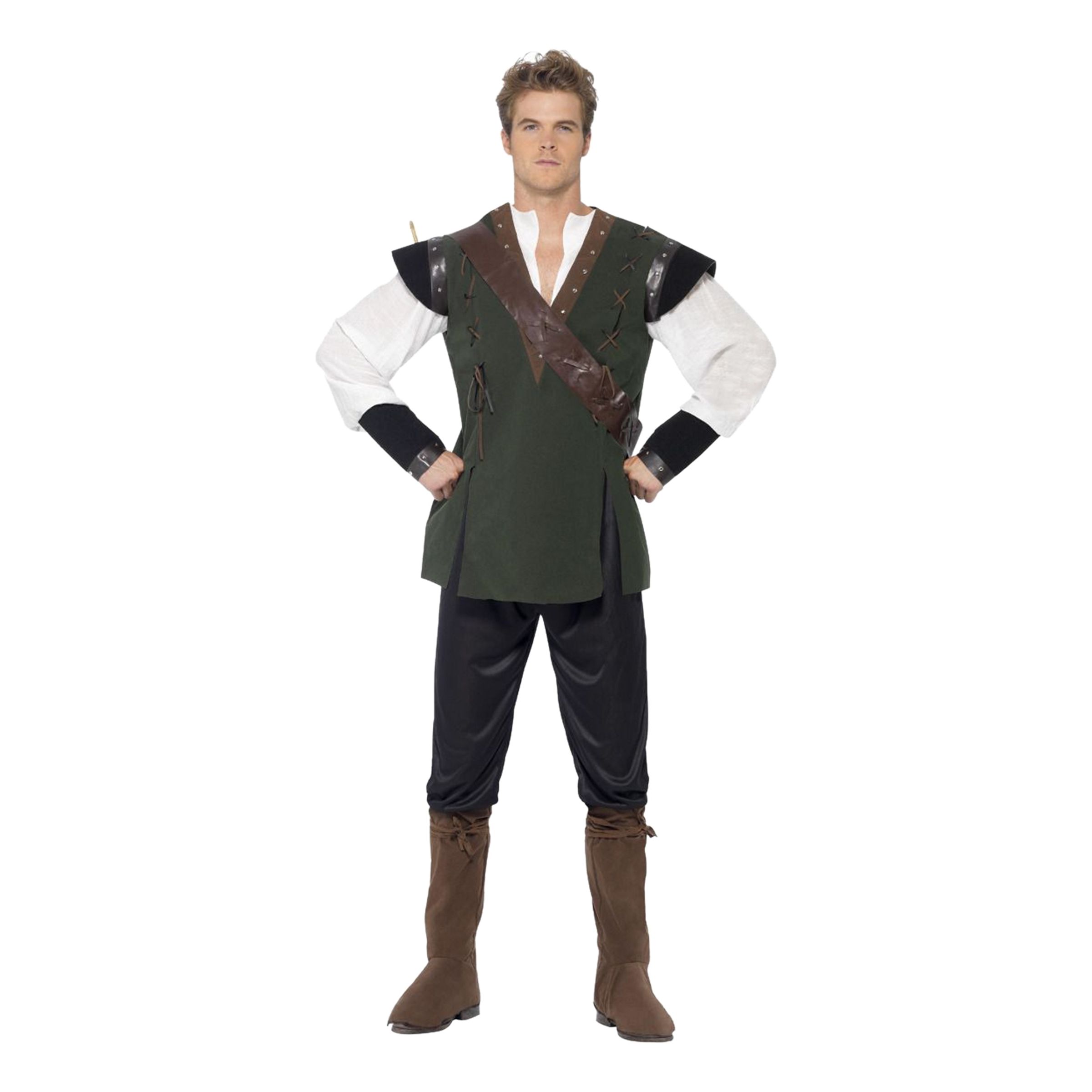Robin Hood Maskeraddräkt inkluderar en överdel med vita pösiga ärmar och en fastsydd väst i grönt. Tvärs över bröstet sitter ett brunt bälte, samt svarta detaljer på axlar och ärmar. Det medföljer även ett par svarta byxor samt ett par bruna skoöverdrag.