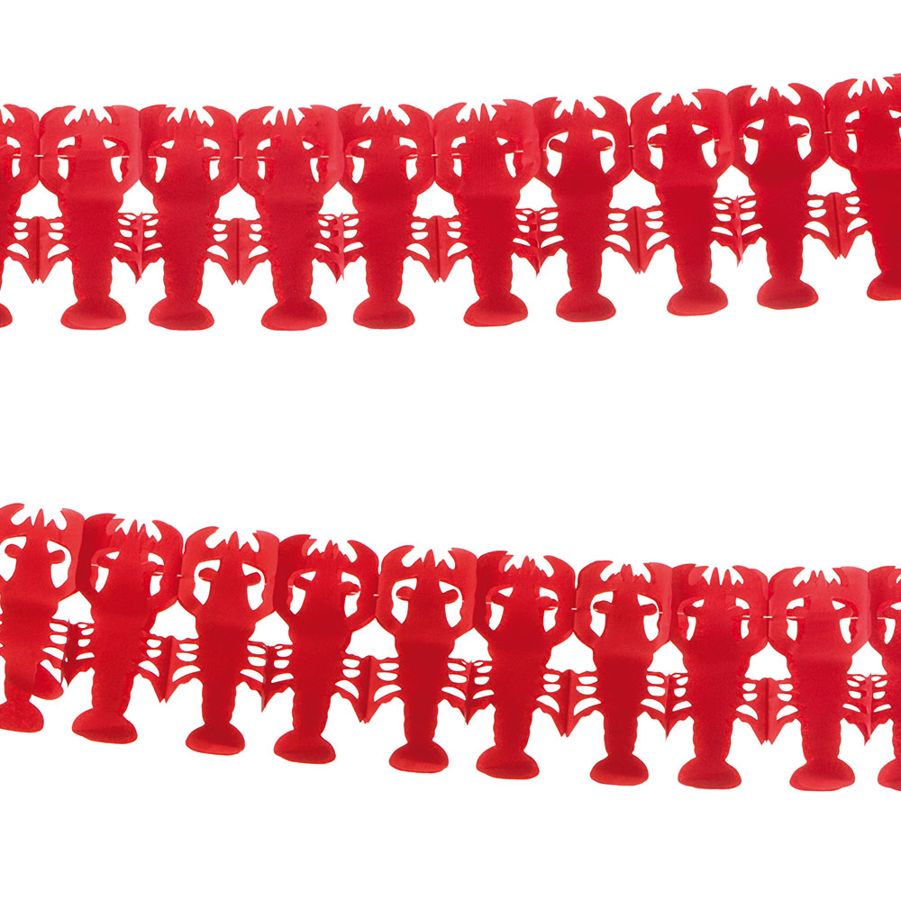 Röd Kräftgirlang består av en röd girlang med kräftor. Vik ut girlangen och häng upp den i det lilla snöret. Tillverkad i papp.