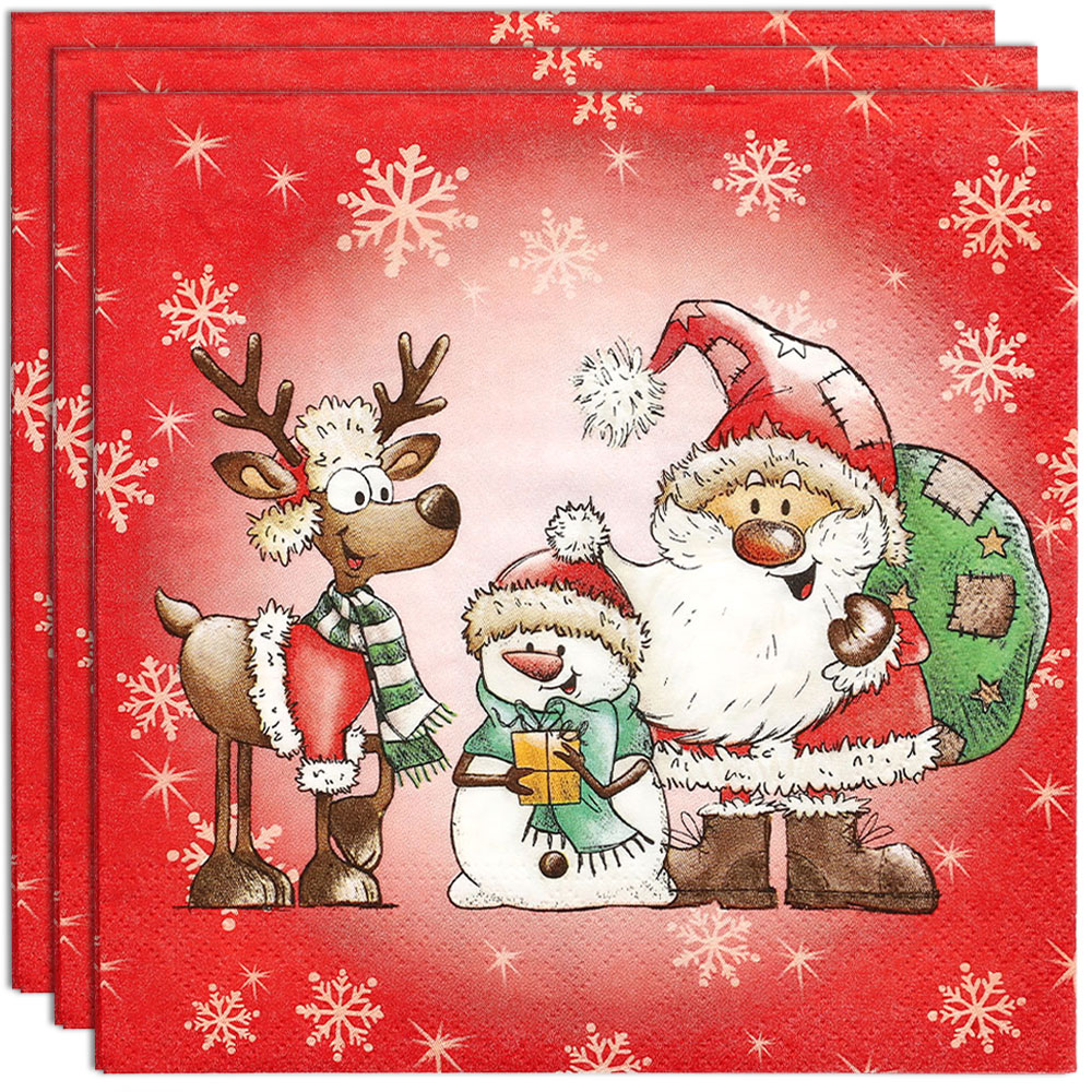 Här har du fina jul-servetter med tryck av en glad ren, snögubbe och tomte på en röd bakgrund med snöflingor som passar lika bra på julbordet som till decoupage och andra roliga julpyssel för både barn och vuxna.