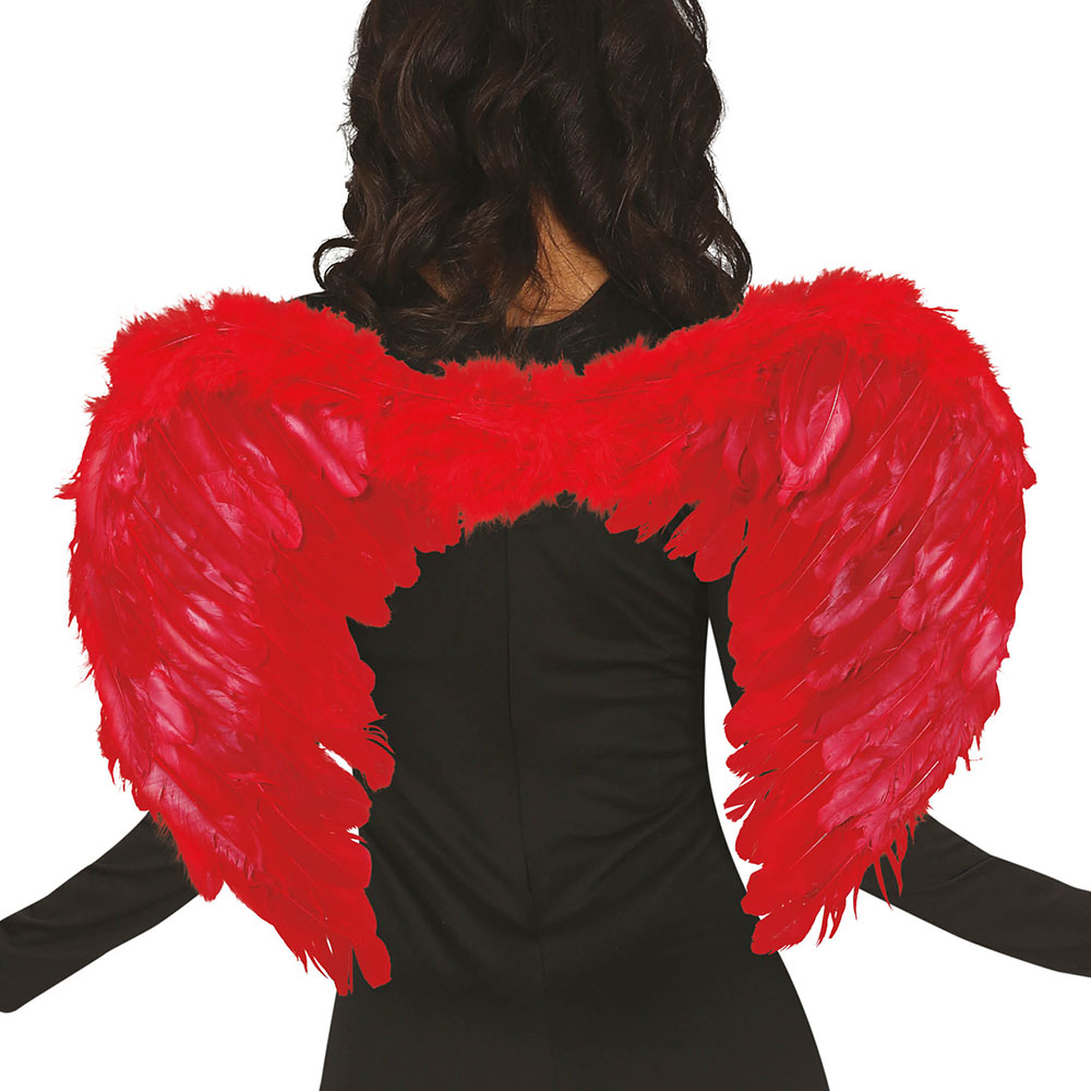Perfekt för en Halloween eller maskerad fest, dessa röda djävulsvingar med fjädrar fästes enkelt på ryggen med elastiska band, vilket gör varje fest minnesvärd och spektakulär.