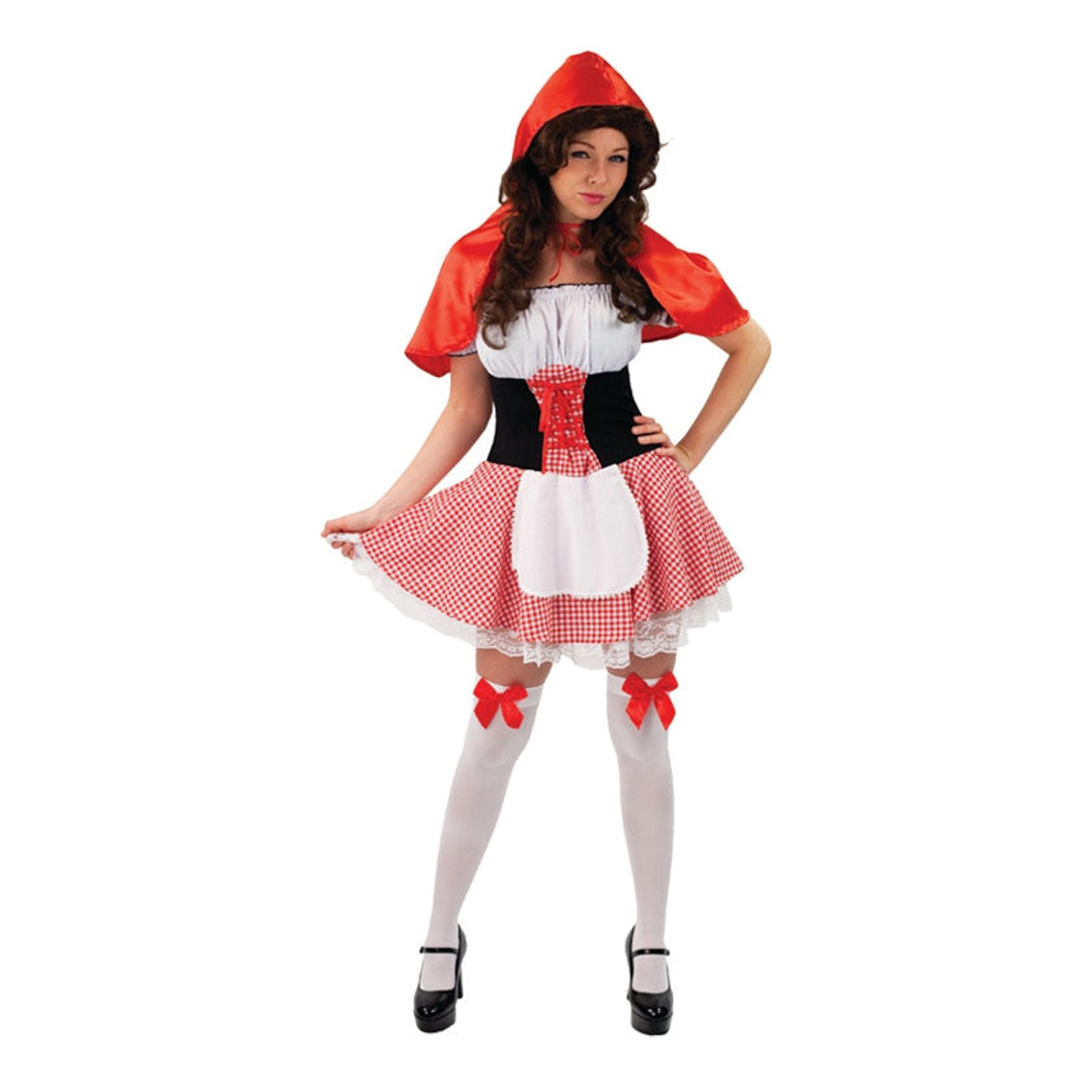 Rödluvan Budget Maskeraddräkt inkluderar en röd/vit rutig klänning med vit topp och svarta sidor vid midjan. Klänningen har röd snörning på framsidan och dragkedja längs ryggen. Ingår gör även ett vitt litet förkläde, en vit underkjol med spets samt en röd mantel i satinfinish som du kan knyta fast runt halsen.