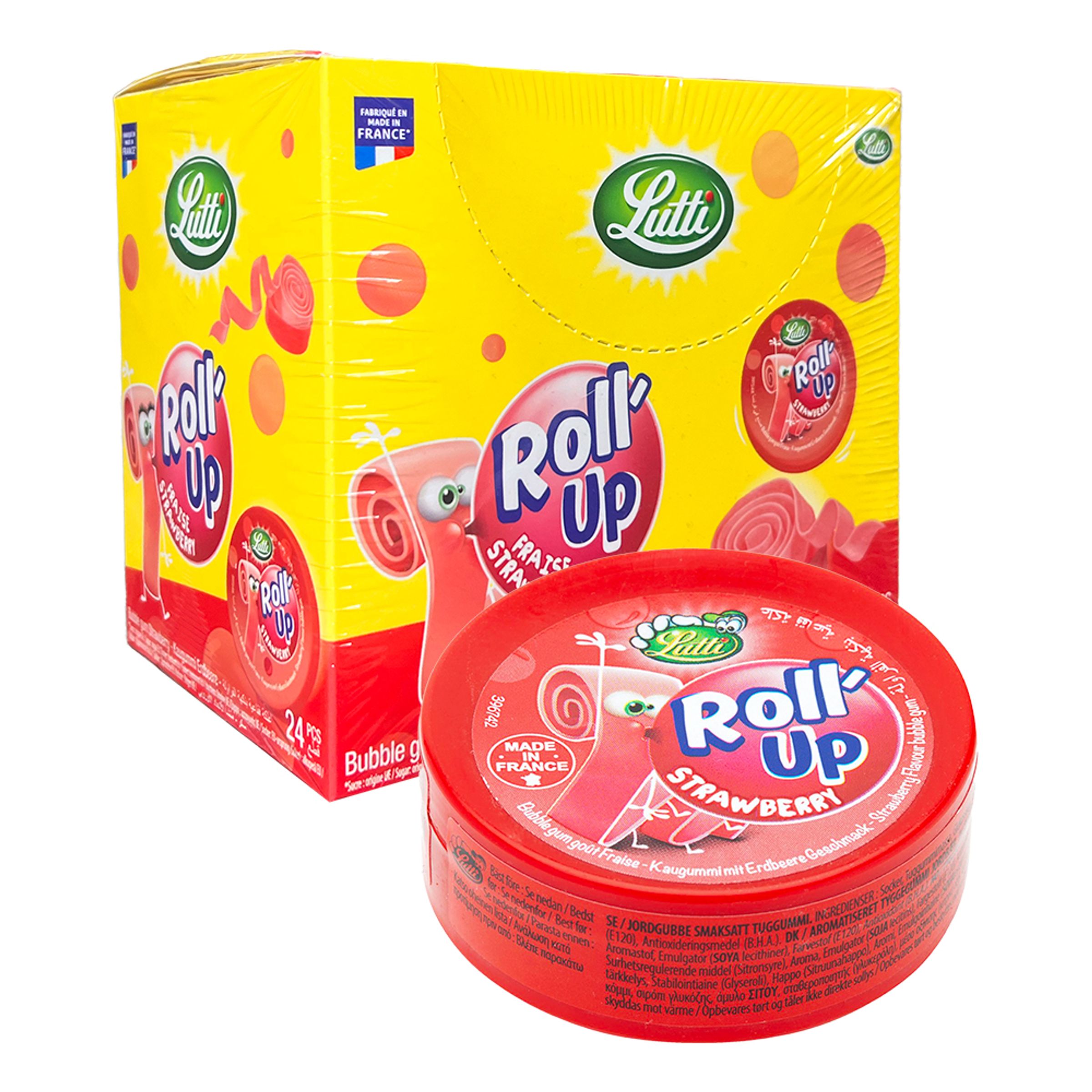 Roll-Up Jordgubbe Tuggummi kommer i en rund röd förpackning och innehåller en lång rulle av tuggummi i smaken jordgubb.