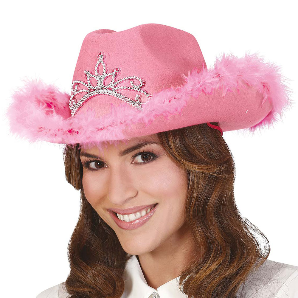 – Rosa cowboyhatt med fluff och en silvrig glittrande tiara