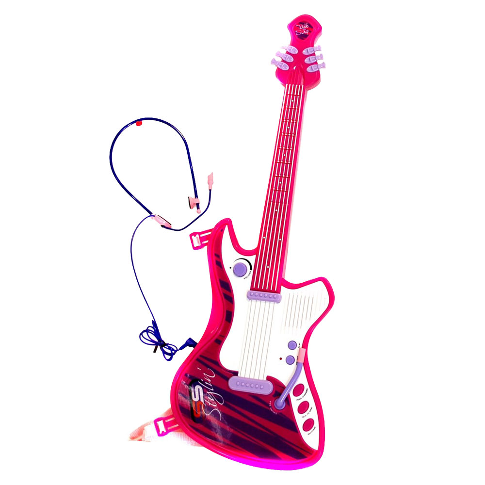 Rosa Leksaksgitarr med Headset omfattar en rosa leksaksgitarr av plast med ett mikrofon-headset. Gitarren är försedd med åtta olika noter och, sex olika rytmer och fyra olika röstförvrängningar. Den drivs av 3 st AA-batterier och är ca 57 cm lång, 20 cm bred samt 2,5 cm hög.