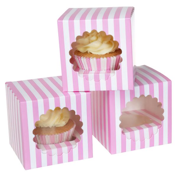 Rosa och Vita Cupcake Kartonger består av 3 stycken randiga cupcake kartonger i vitt och rosa med plats för en bakelse i varje. Kartongerna är tillverkade av papp och är ca 9 x 9 x 9 cm stora.