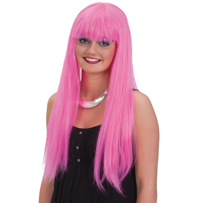 Se till att synas på nästa maskerad kalas och tema fest med en härlig rosa peruk med långt hår och lugg, en riktigt snygg peruk som får dig att sticka ut. Matcha denna tjusiga peruk med passande kostym outfit och dräkt eller bär den som den är för en extra kul detalj till dina vanliga kläder med en rosa peruk blir du garanterat en stilig party prinsessa var du än är.
