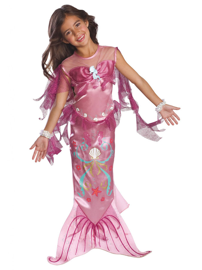 Rosa Sjöjungfru Klänning Barn är en rosa klänning med spets-detaljer. Nedre delen av klänningen är formad som en fena och dekorerad med snäckor, sjöstjärnor och blad. Finns även två armband med som sitter fast i spetsen för en fin effekt.