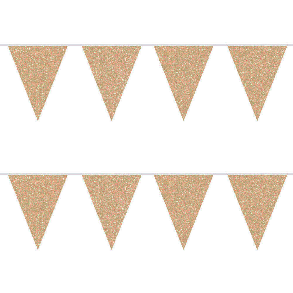 Rosé Guld kan vara en av de snyggaste färgerna att dekorera med och denna Flaggirlang är inget undantag med sitt glittriga utseende och snygga vimplar, den kommer verkligen att förgylla din fest!
