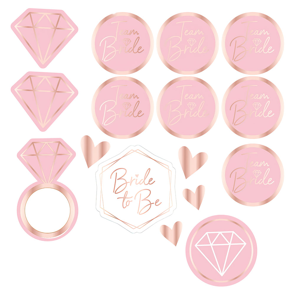 Roséguldiga Gnuggis Tatueringar Team Bride omfattar ett ark låtsas tatueringar i roséguld och ljusrosa. Tatueringarna föreställer små hjärtan, diamanter, en diamantring, texten "Bride To Be" och "Team Bride". Tatueringarna mäter ca 1,2 x 1,2 – 5 x 3 cm. Appliceringsinstruktioner finns på förpackningen.