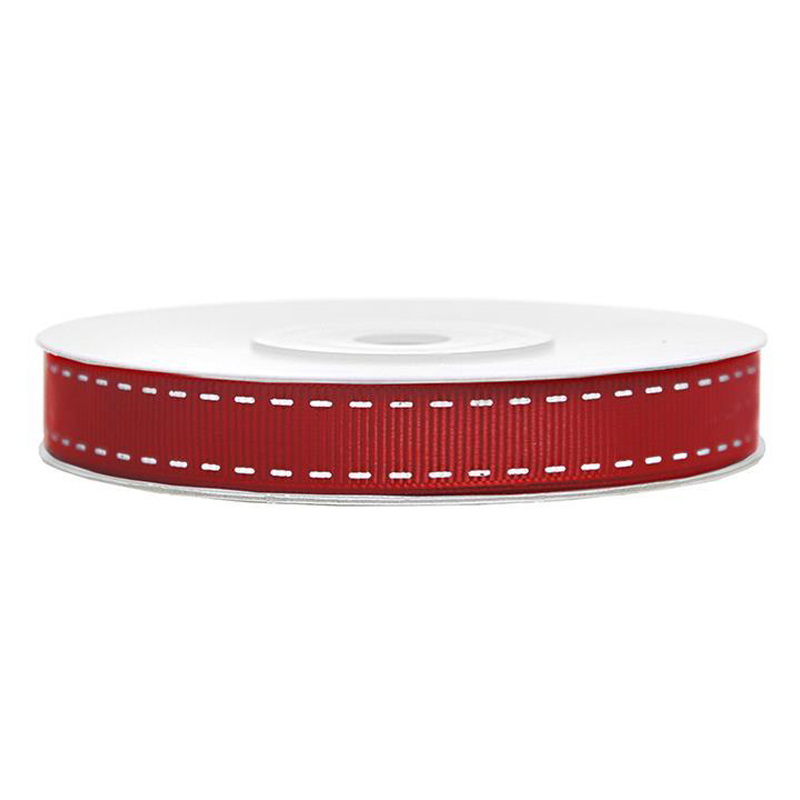 Rött Dekorationsband med Streck omfattar ett rött, ribbat dekorationsband av polyester med vita streck längst kanten. Bandet är ca 15 mm brett och 25 meter långt.