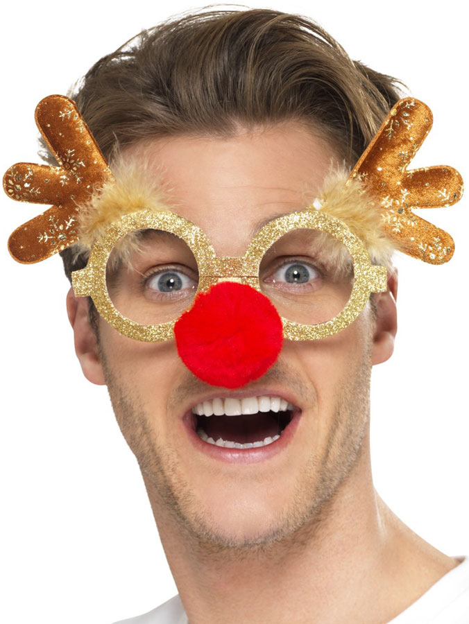 Rudolf Glasögon omfattar ett par runda glasögon med guldglitter, en fluffig röd mule samt utstickande renhorn. Glasögonen kommer utan glas och blir utmärkt som komplement till resten av din stämningsfyllda jul-outfit.