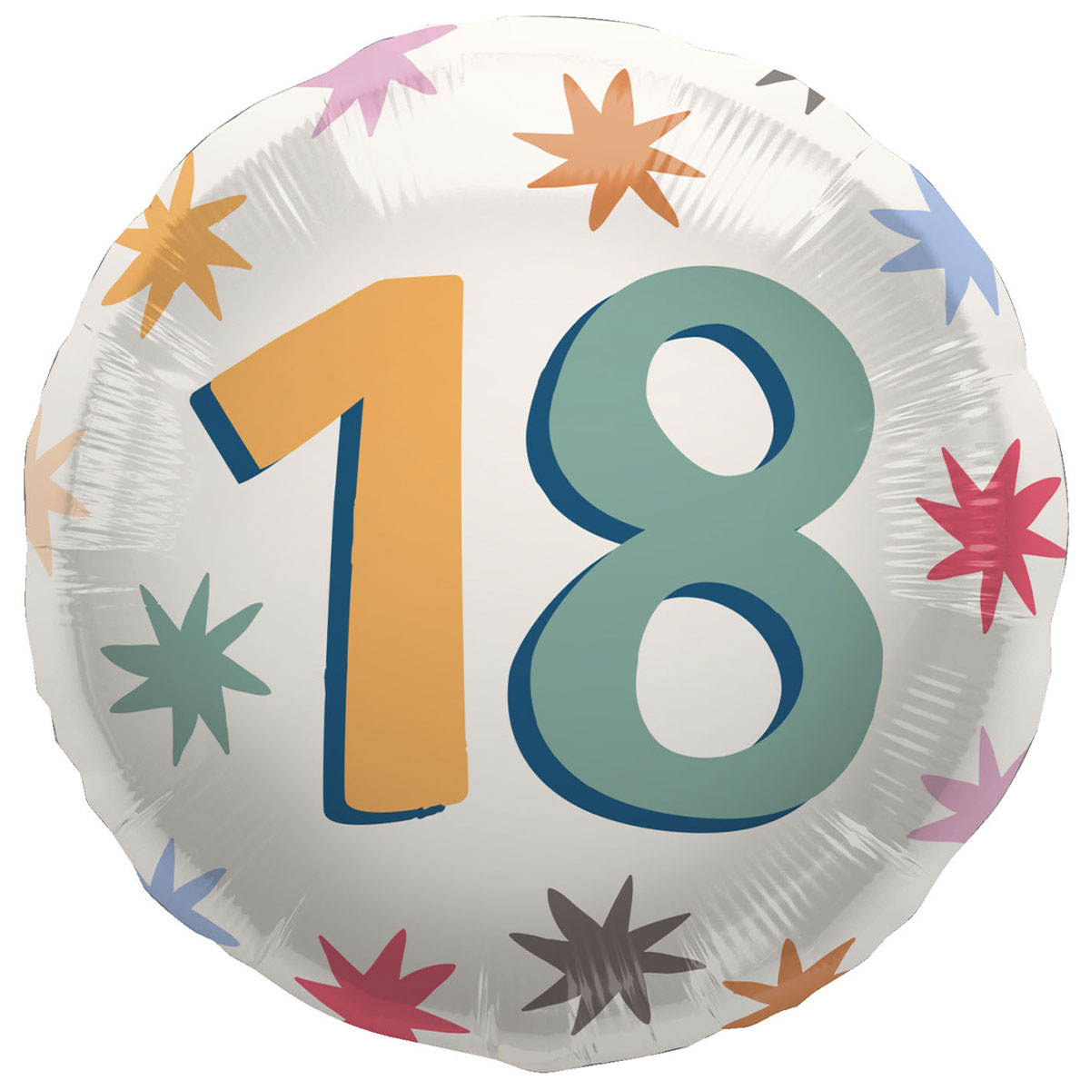 Rund Folieballong med Stjärnor 18 år omfattar en rund vit folieballong med siffran 18 i gul och grön samt stjärnor i svart, blått, grönt, orange, rött, brunt och rosa.
