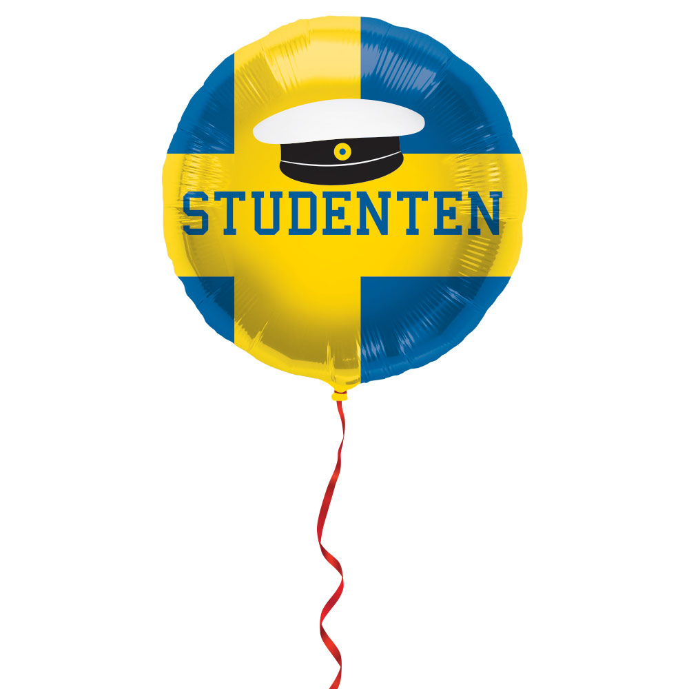 En folieballong med svenskaflaggan i bakgrunden med en studentmössa och texten "studenten" på är en riktigt fin student present. Student-ballongen blir även en snygg dekoration till student-festen. Student ballongen går att fyllas med helium eller vanlig luft och har även en plats för ballongsnöre för att hängas upp som dekoration på examensfesten eller studentmottagningen.
