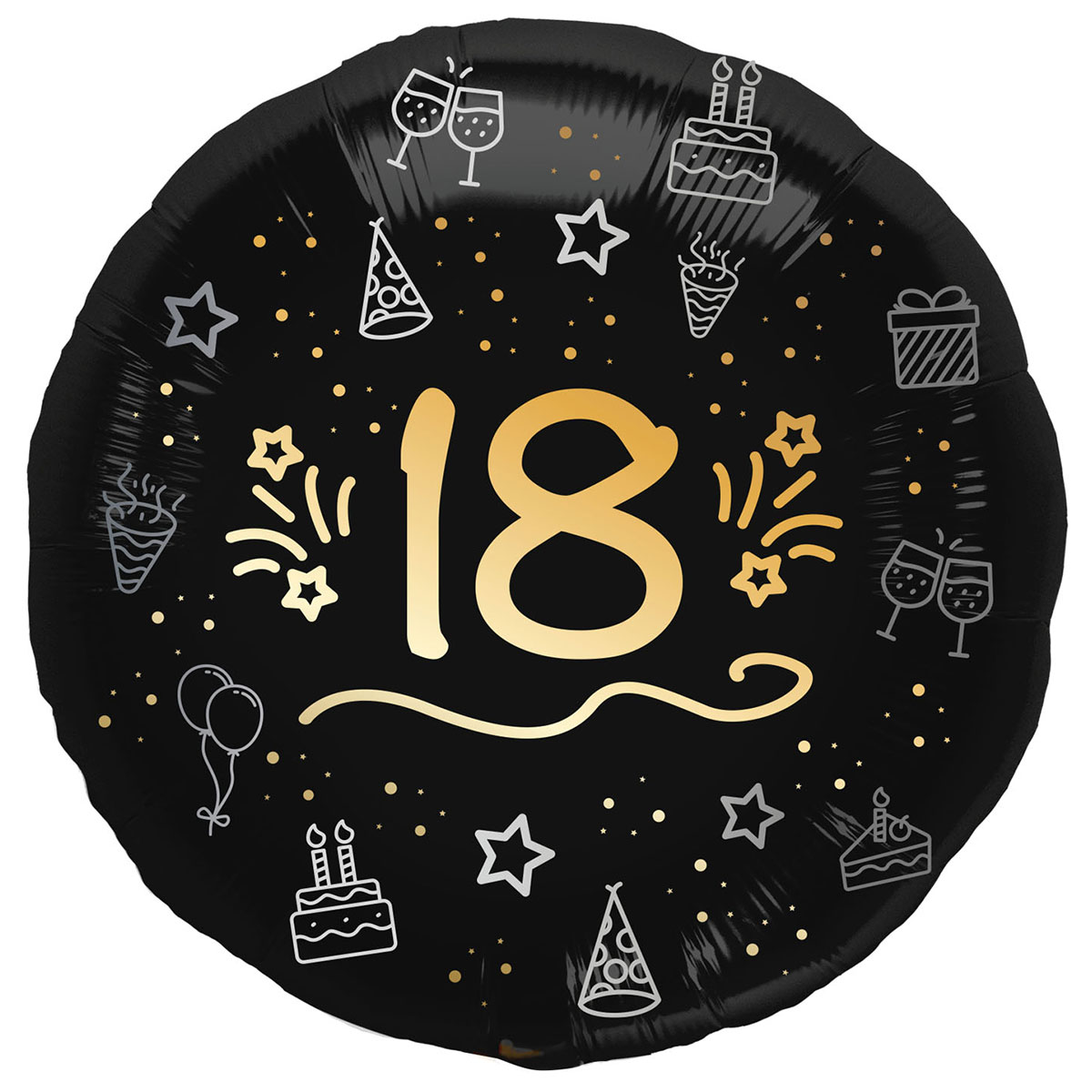 Rund Folieballong Svart 18 år omfattar en rund svart folieballong med siffran 18, stjärnor och prickar i guldfärg samt tårtor, stjärnor, partyhattar och dricksglas i silverfärg.