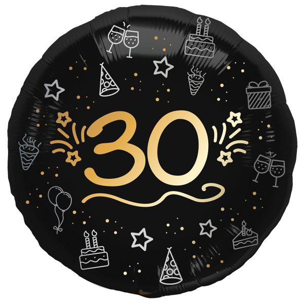 Rund Folieballong Svart 30 år omfattar en rund svart folieballong med siffran 30, stjärnor och prickar i guldfärg samt tårtor, stjärnor, partyhattar och dricksglas i silverfärg.
