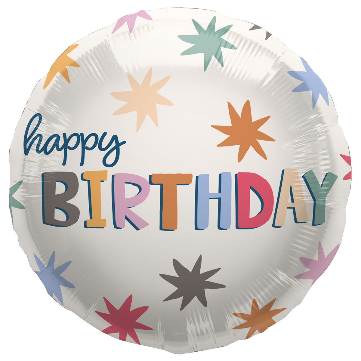 Rund Happy Birthday Folieballong med Stjärnor omfattar en rund svart folieballong med texten "Happy Birthday" och stjärnor i svart, blått, grönt, orange, rött, brunt och rosa.