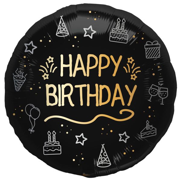 Rund Happy Birthday Folieballong Svart omfattar en rund svart folieballong med texten "Happy Birthday", stjärnor och prickar i guldfärg samt tårtor, stjärnor, partyhattar och dricksglas i silverfärg.
