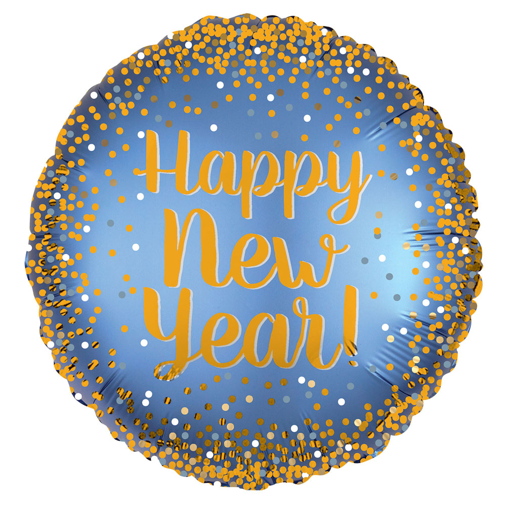 Rund Nyårsballong Folie består av en rund folieballong i blått med motiv av prickar i guld, silver och vitt samt texten "Happy New Year" i guld och silver.