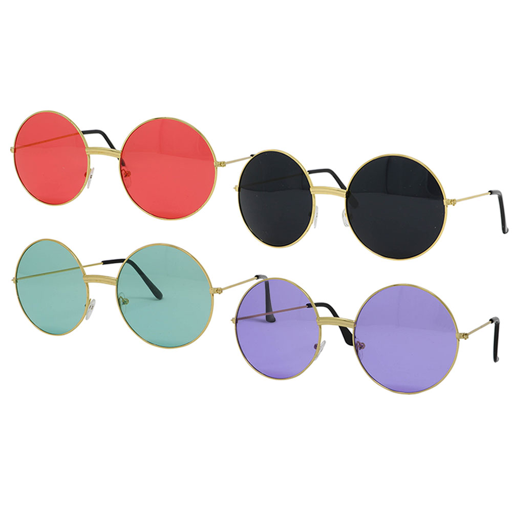 Runda Glasögon Hippie omfattar ett par runda plastglasögon med guldiga bågar samt skalmar i guld och svart. Finns i fyra varianter med linser färgade lila, grön, svart eller röd.