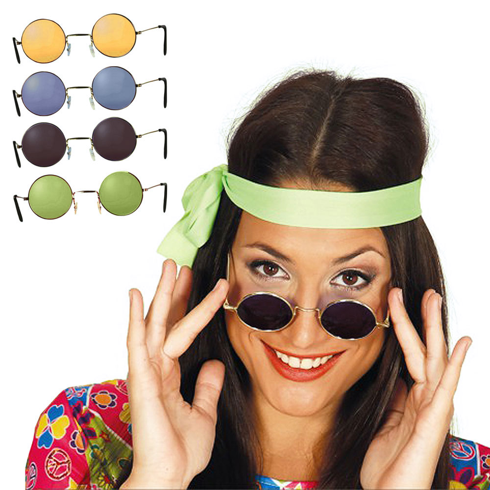 Runda Hippie Glasögon omfattar ett par runda maskeradglasögon med färgat glas för vuxna. Glasögonen är i plast och metall och är ca 11,5 cm breda. Finns i fyra olika färger, vilken färg du får slumpas.