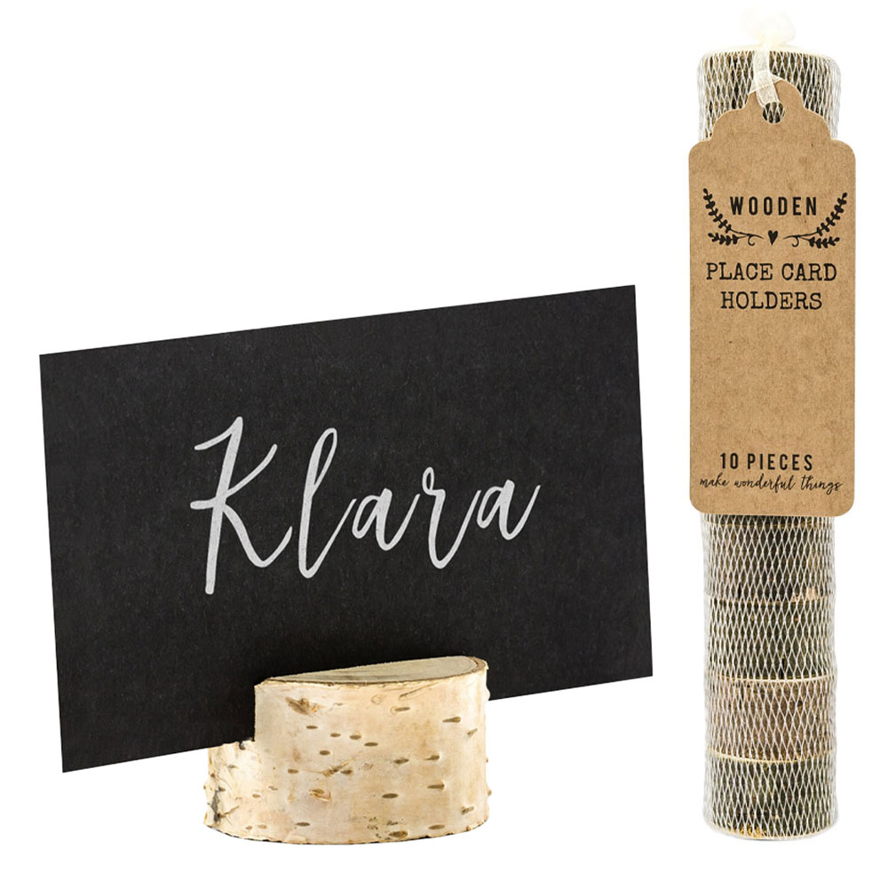 Placeringskorthållare av rejält trä för alla som vill duka fram placeringskorten på ett riktigt snyggt sätt! Med dessa hållare för placeringskort kan du enkelt få till en rustik detalj till dukningen. Ett utmärkt val för alla som söker snygga dukningstillbehör till firandet i lantligt tema.