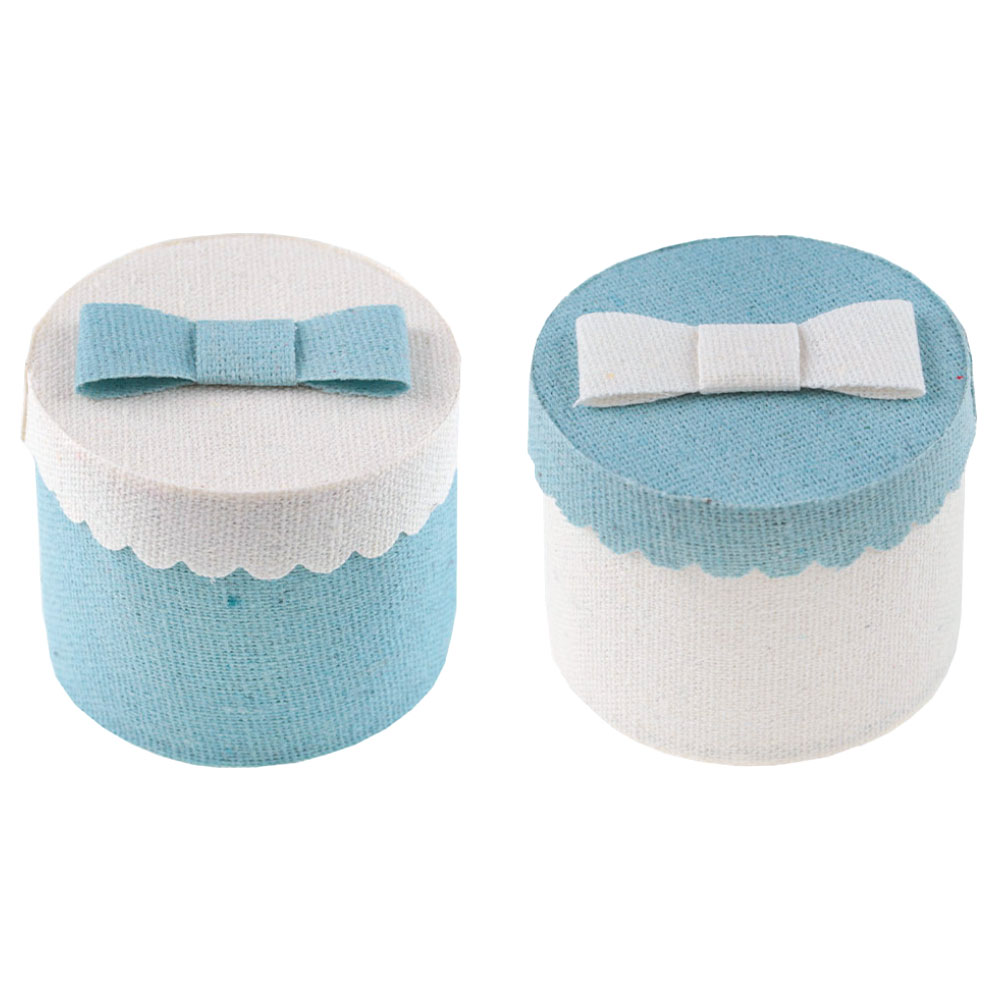 Runda Presentaskar Vit och Ljusblå omfattar 4 stycken runda små presentaskar i vitt och ljusblått som mäter ca 5,5 cm i diameter och är ca 4 cm höga. Askarna är tillverkade av polyester och bomull och passar till förslagsvis godis och små presenter.