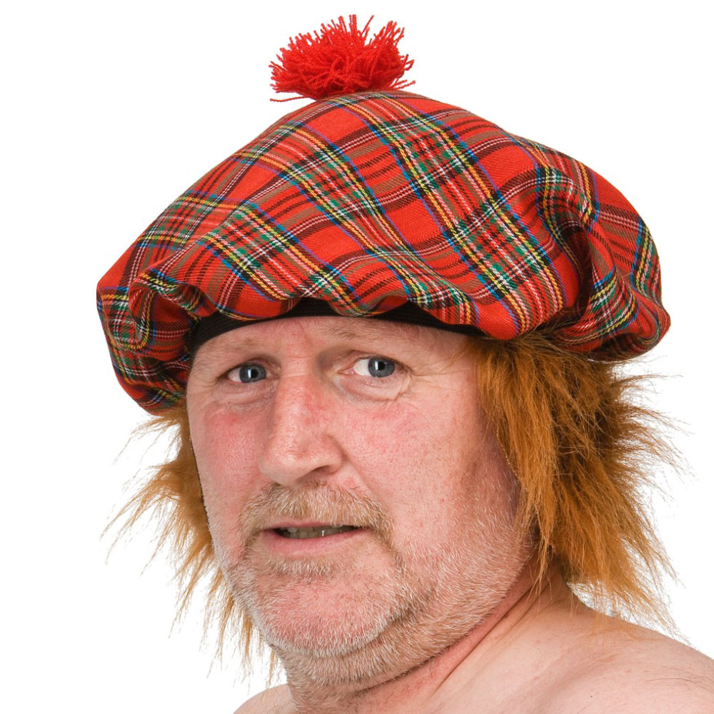 Rutig Skotsk Hatt med Hår omfattar en röd-rutig skotsk hatt av polyester med röd textilboll på toppen samt rött hår baktill. Hatten är elastisk och passar vuxna.