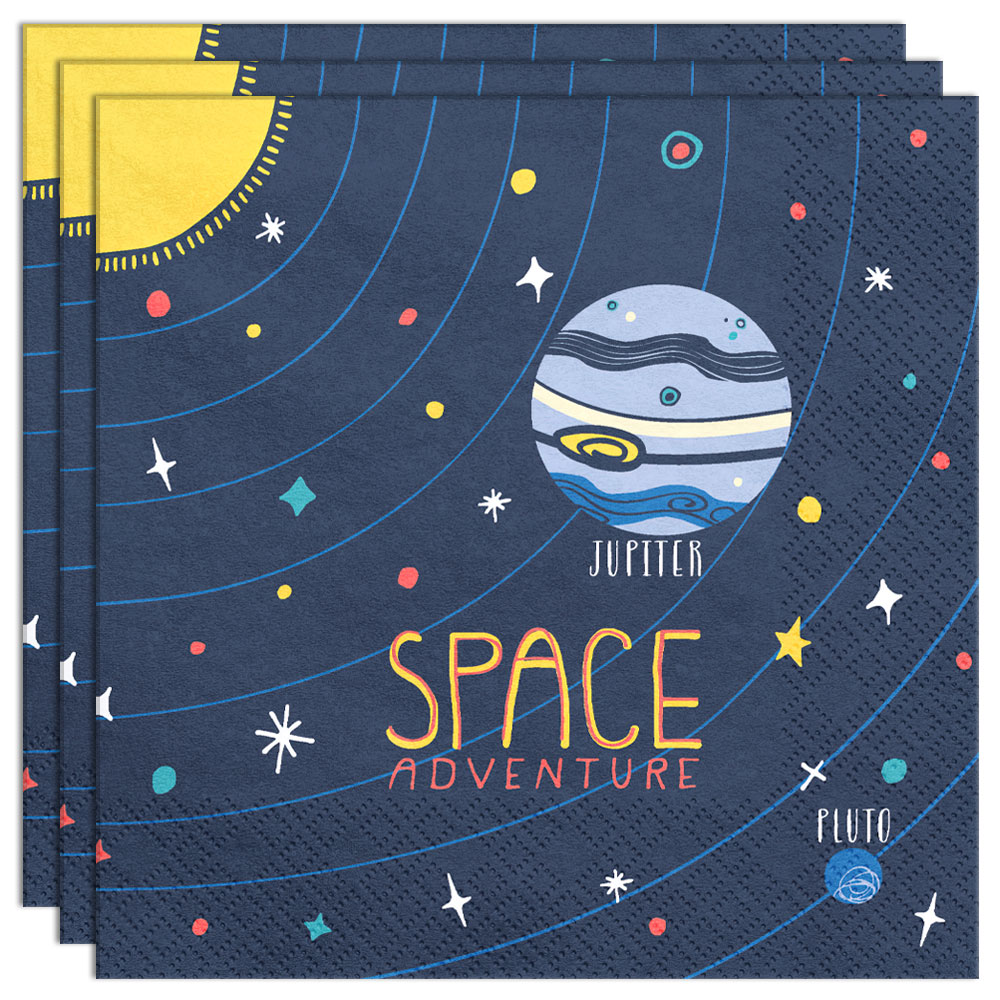 Rymd Kalas Servetter omfattar ett 20-pack servetter i mörkblått med rymdmotiv i olika färger och texten "Space Adventure". Servetterna är i tre lager och är ca 33 x 33 cm stora utvikta.