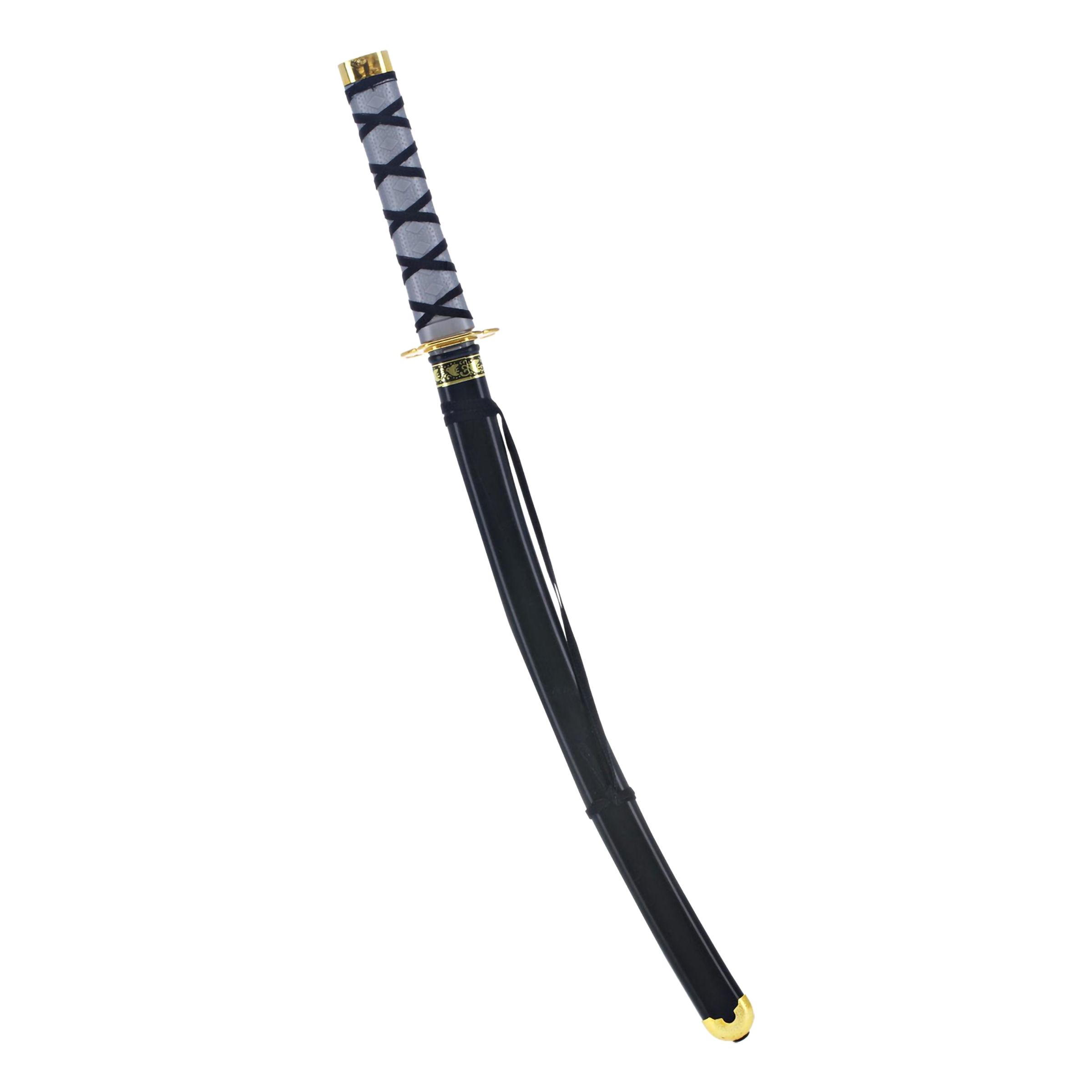 Samurajsvärd har en klassisk och stilren design med en böjd, grå klinga i plast som efterliknar en traditionell katana. Medföljer gör en svart, glansig svärdsslida med gulddetaljer längst ner – redo att bäras vid sidan av.