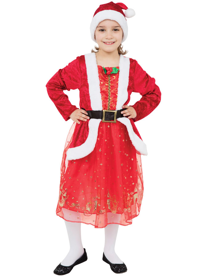 Santa Girl Tomteklänning Barn innehåller en röd-vit långärmad tomteklänning med kjol som har detaljer i guld, samt ett svart bälte i midjan. Ingår även en söt tomteluva.