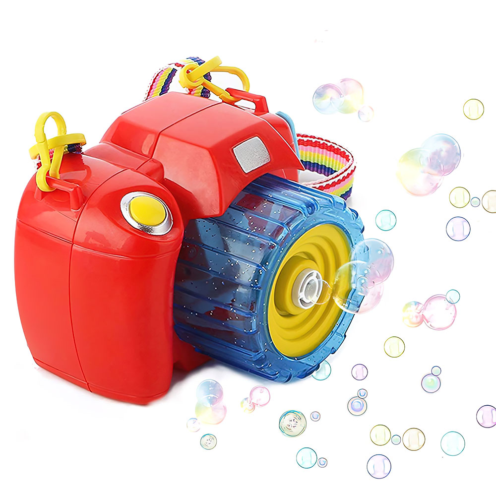Såpbubbelmaskin Kamera omfattar en såpbubbelmaskin som är formad som en kamera i färgerna rött, blått och gult. Häll i såpbubblevätskan och tryck på knappen för att få den att blåsa ut såpbubblor. Kameran gör även ljud ifrån sig och lyser upp i en ljusshow. Såpbubbelvätska medföljer.