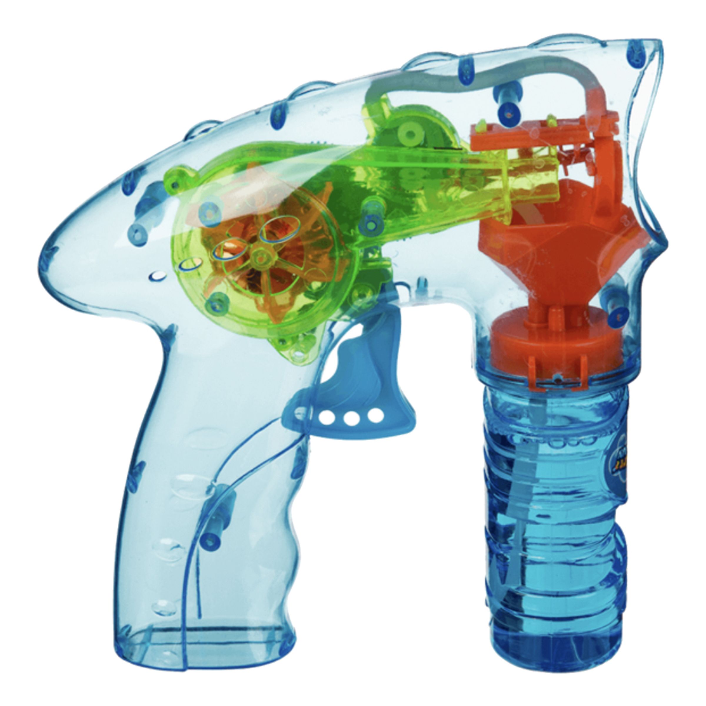 Bubble Gun med LED är en pistol som sprutar ut såpbubblor och lyser i olika LED-färger. Bruksanvisning på engelska ingår, liksom batterier och såpa till såpbubblorna.