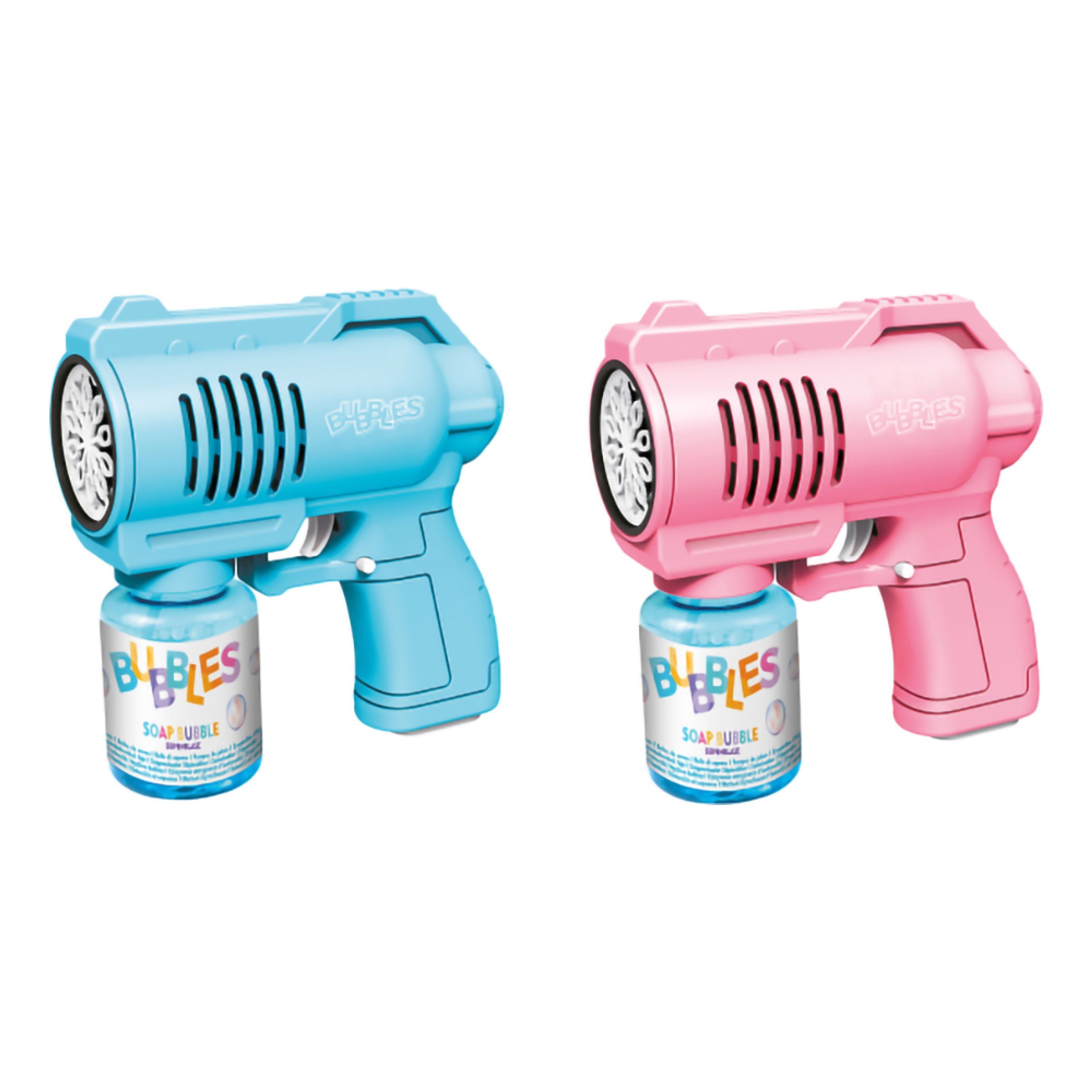 Såpbubbelpistol består av en cool såpbubbelmaskin som säljs osorterat i rosa och blå färg. Du fäster fast burken med spåbubbelvätska och sedan är det bara att trycka på avfyraren!