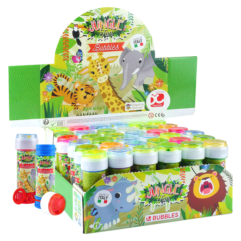 Härliga såp-bubblor för alla djungeltokiga barn! Ska du ha kalas med tema djungel är dessa såpbubblor ett måste för massa skojigt såpbubbel. Klä ut er till giraff, elefant eller till och med tiger för ett riktigt kul barn-kalas med djungel-tema, ett kalas bara för er djungeldjur!