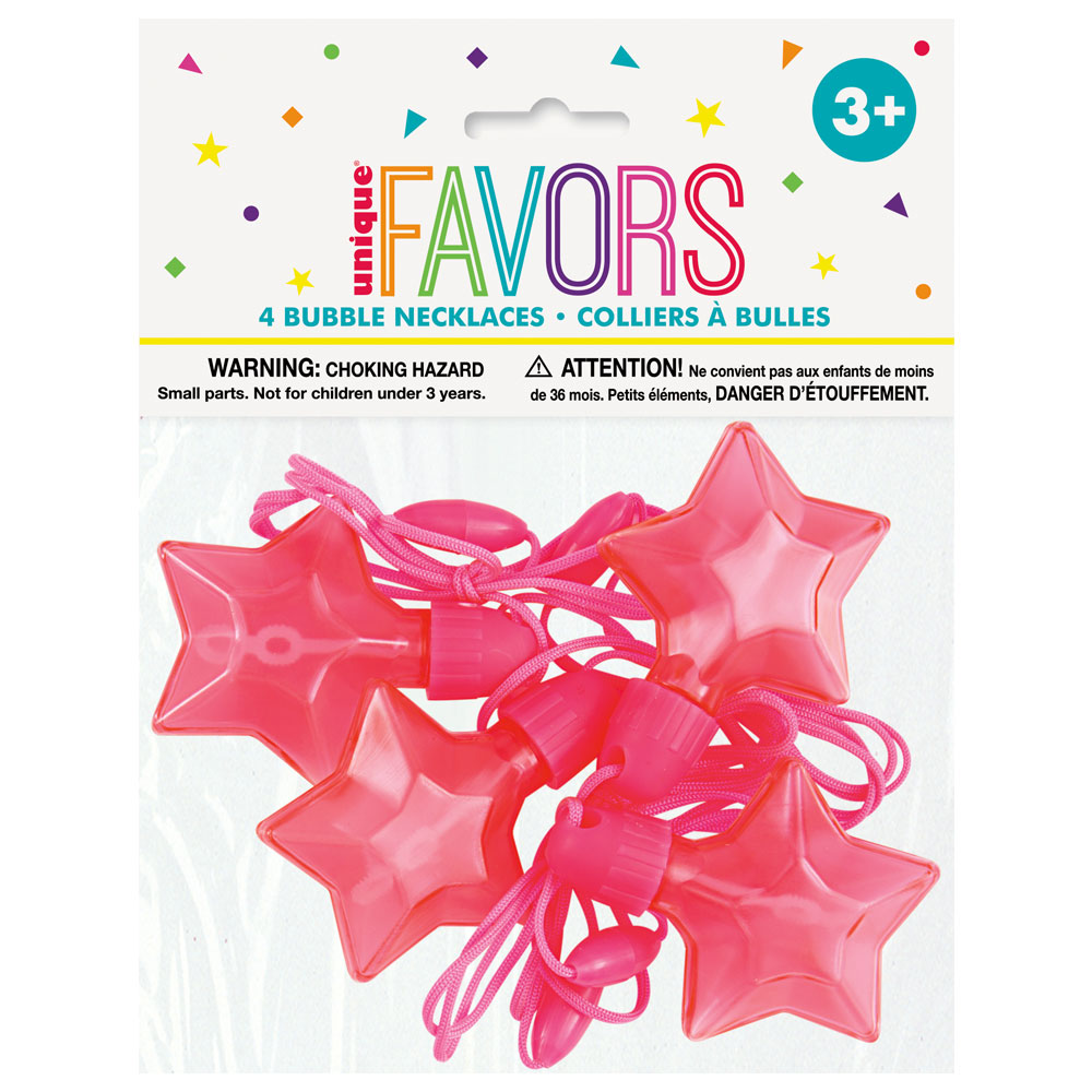 Såpbubblor Stjärnor med Halsband innehåller 4 stycken söta halsband i rosa med vardera stjärnformad liten flaska innehållande såpbubblor. Pinne för att blåsa upp bubblorna medföljer.
