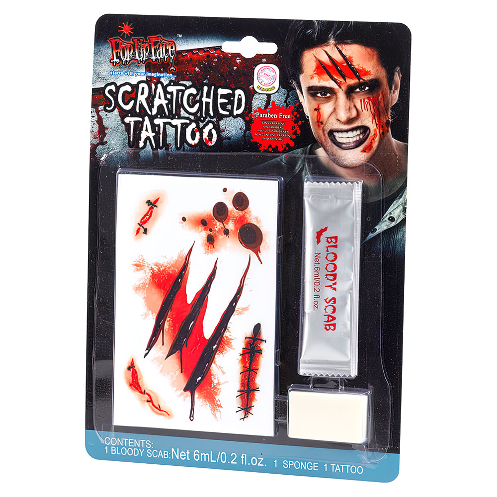 Fullborda din halloweensminkning med läskiga rivsår på bara några minuter med hjälp av dessa sårtatueringar! Praktiskt set med tamporära låtsas-tatueringar och koagulerat fakeblod som snabbt och enkelt ger dig den rätta halloween-looken. Applicera tatueringarna precis hur du vill på kroppen eller i ansiktet och komplettera med fejk blodet så är du helt klart redo för halloweenfest!