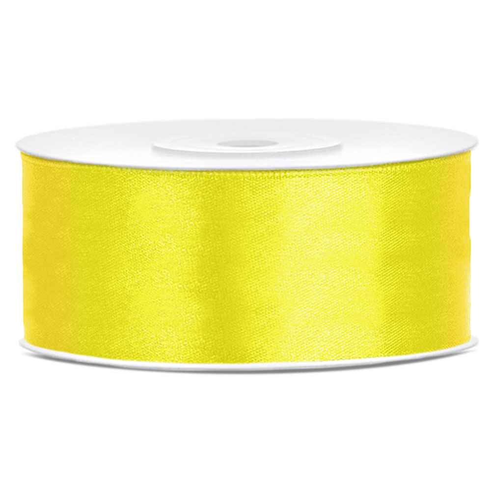 Satinband Gul 25 mm omfattar ett gult satinband av polyester på rulle. Bandet är 25 mm brett och 25 meter långt.