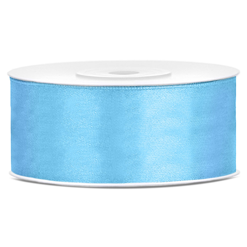 Satinband Himmelsblå 25 mm omfattar ett himmelsblått satinband av polyester på rulle. Bandet är 25 mm brett och 25 meter långt.