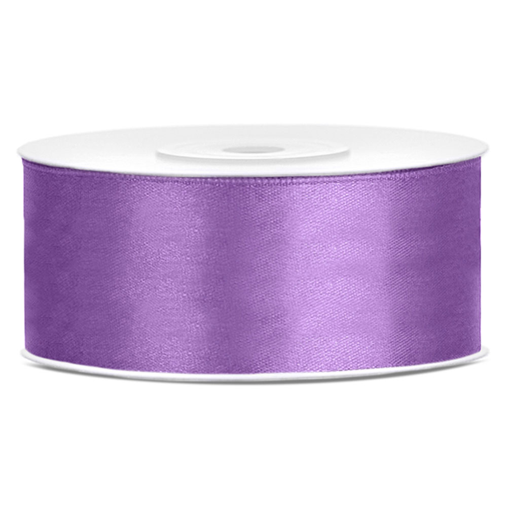 Satinband Lavendel 25 mm omfattar ett lavendel-lila satinband av polyester på rulle. Bandet är 25 mm brett och 25 meter långt.